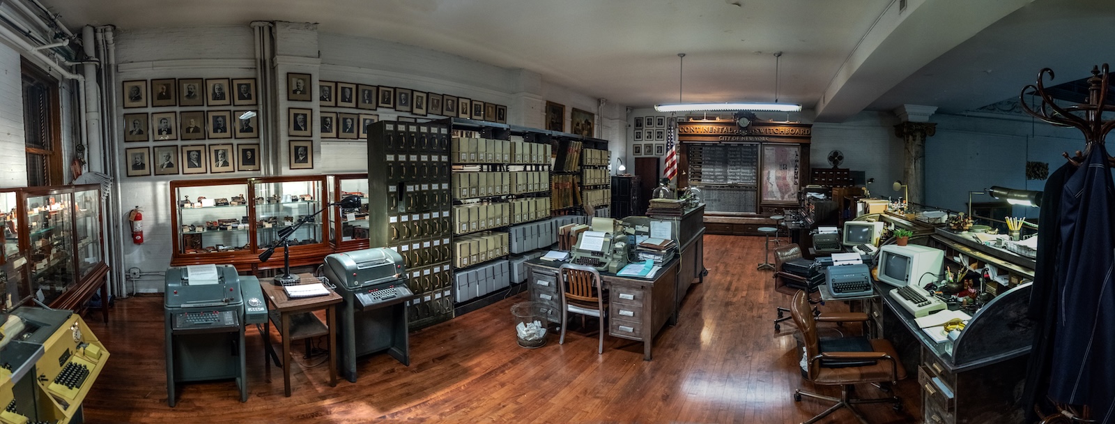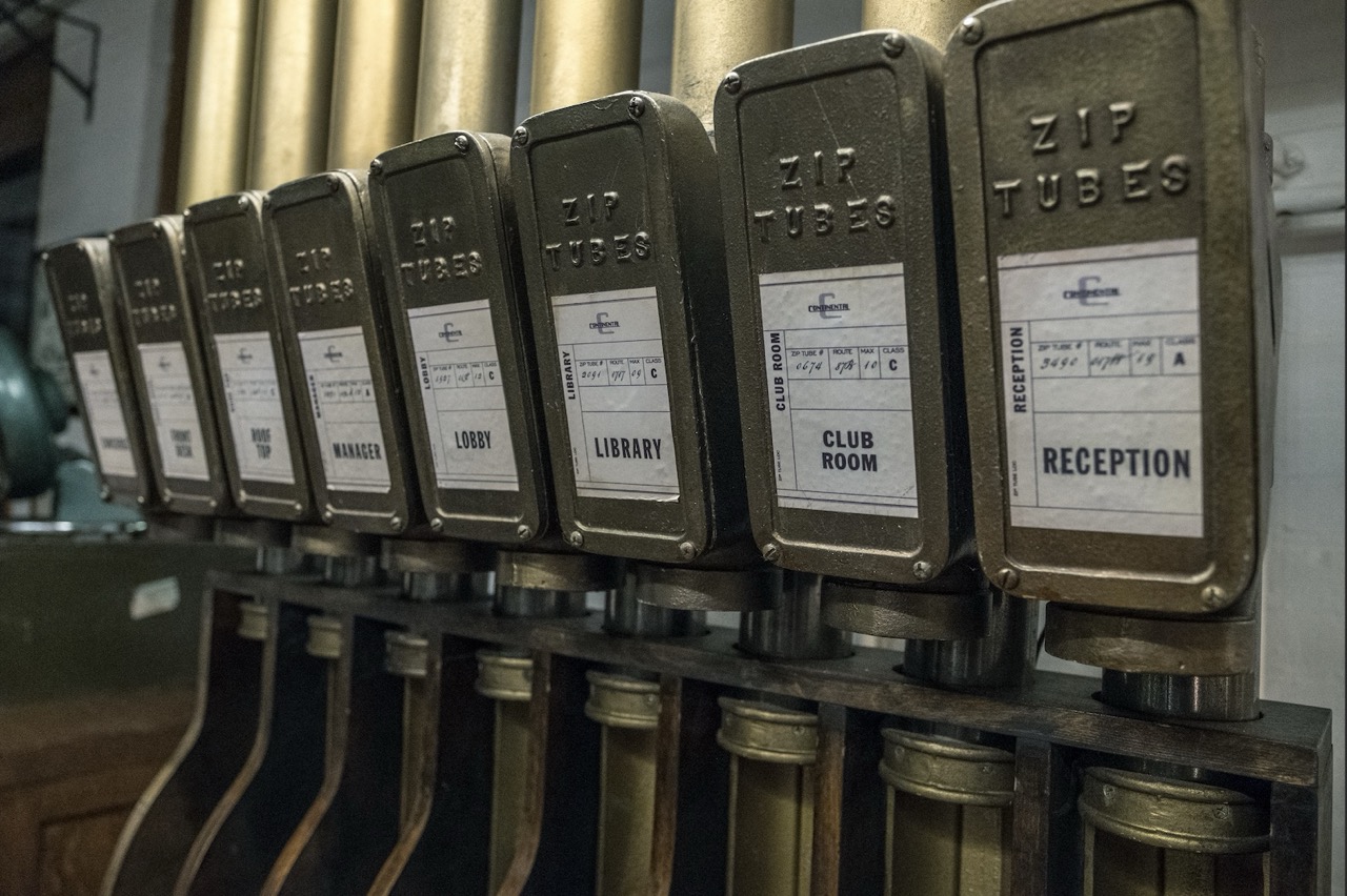 old computers, old phone patchboards, and a pneumatic tube system for delivering messages.