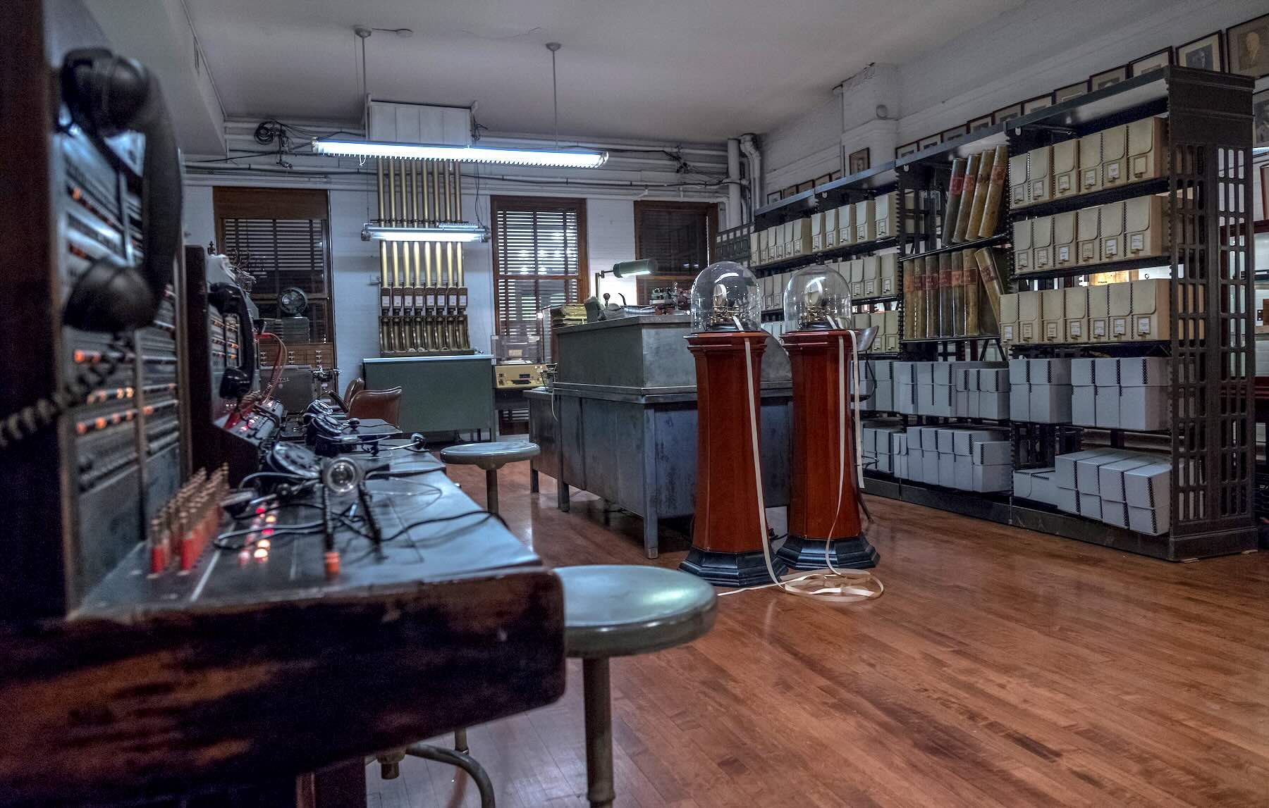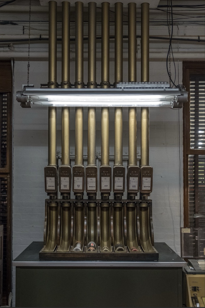 old computers, old phone patchboards, and a pneumatic tube system for delivering messages.