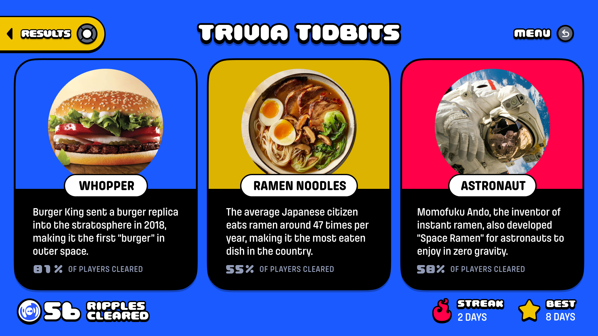 Players have 30 seconds to unscramble a word puzzle that matches the photo behind the ripple. As time progresses, the ripple clears up, making the puzzle easier.